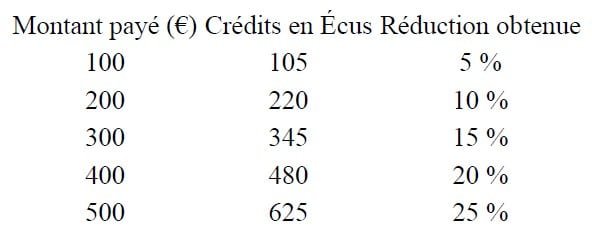 - Programme de fidélité en monnaie interne (« Écus ») : le Client non-abonné peut acquérir des crédits virtuels appelés « Écus », utilisables exclusivement sur le site internet du Vendeur, et permettant de bénéficier de réductions progressives selon le montant chargé :