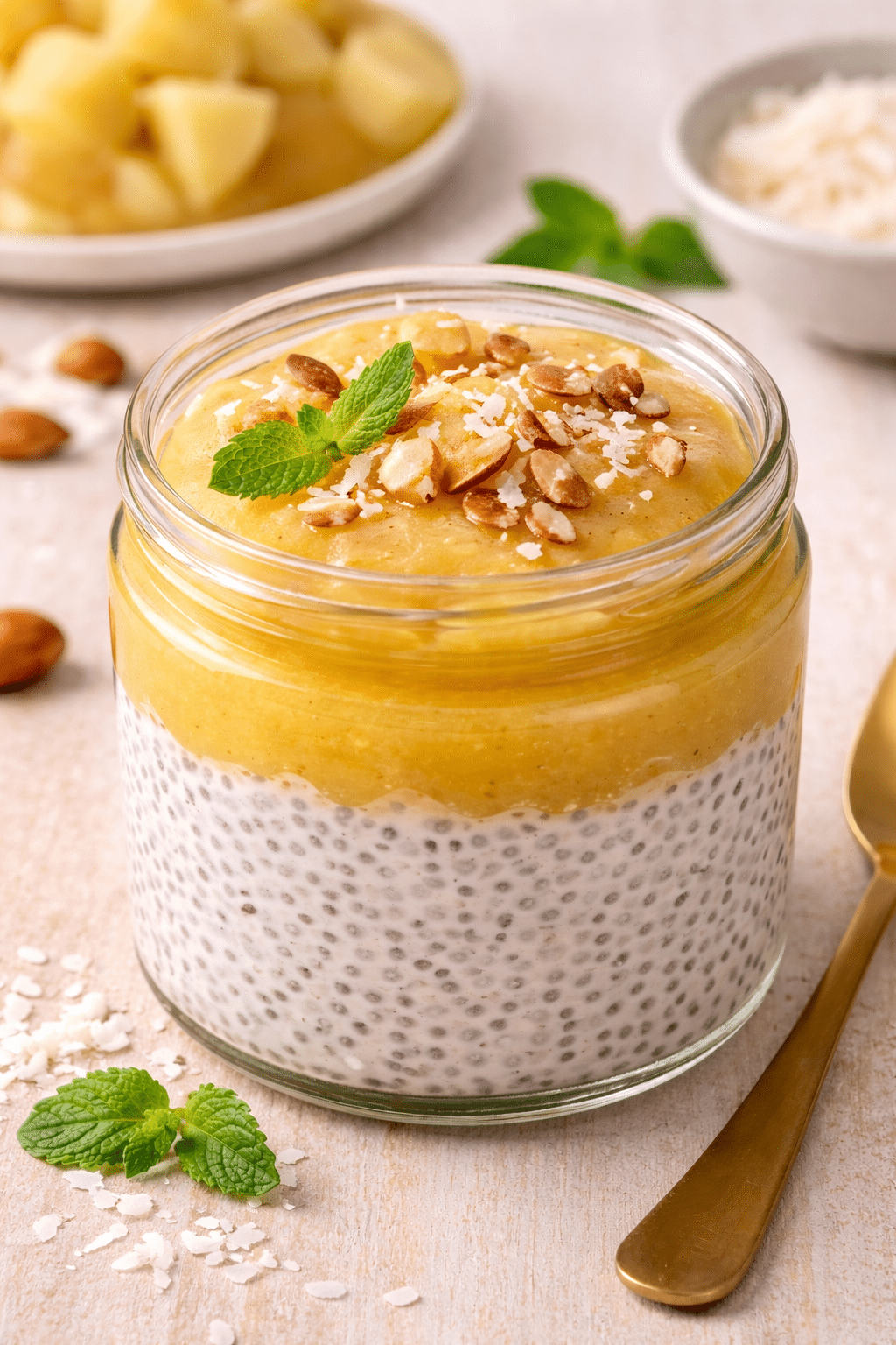 Un dessert frais, léger et 100 % végétal : des graines de chia gonflées dans un lait de coco onctueux, accompagnées d’une compote de fruits douce et naturelle. Un petit pot gourmand, nourrissant et naturellement vegan.