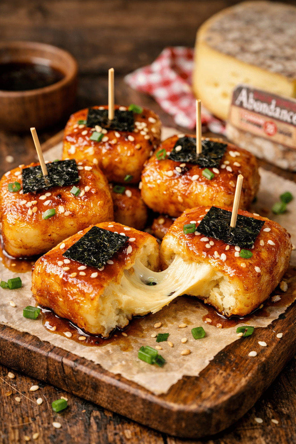 De délicieux mochi croustillants à base de pommes de terre, garnis d’un cœur fondant d’Abondance AOP et de Tomme de Savoie.