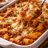 Rigatoni gratinés au four, nappés d’une bolognaise maison préparée avec du bœuf de la Maison Baud (Haute-Savoie). Sauce mijotée, mozzarella fondante et gratin doré : un grand classique généreux et réconfortant.