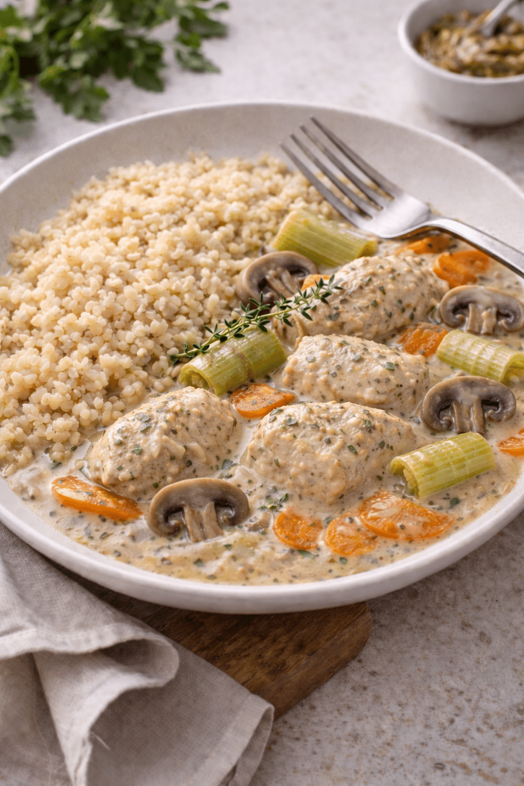 Blanquette de dinde fondante, mijotée dans une sauce onctueuse à la moutarde et aux champignons, avec des légumes fondants et une touche d’herbes. Un plat réconfortant, généreux et plein de douceur.