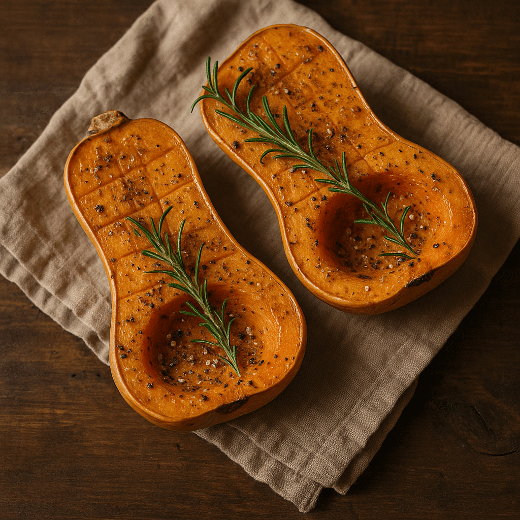 Butternut rôtie au four, simplement salée et poivrée : chair fondante, saveur douce et naturellement sucrée. Végétal, léger, réconfortant.