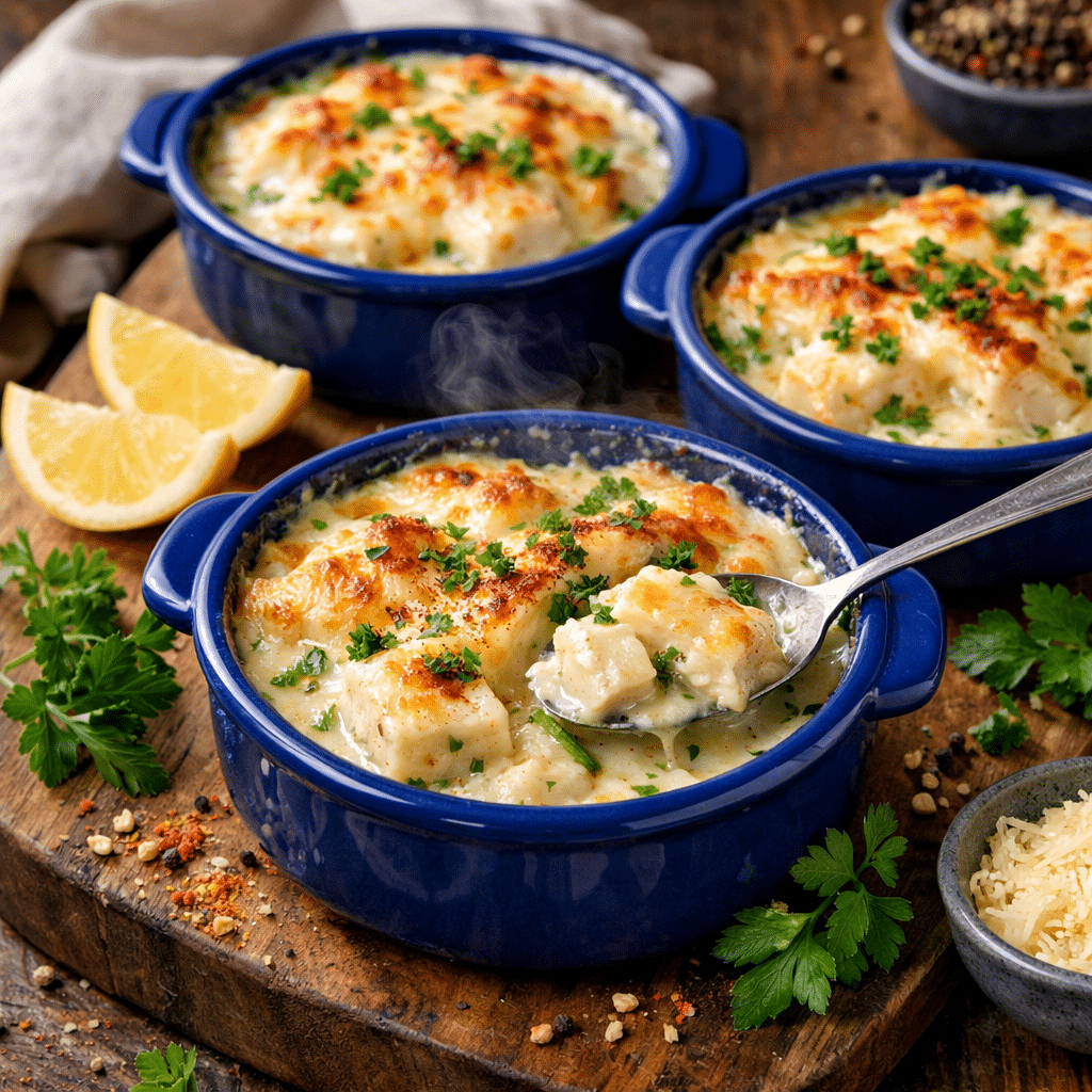 Cubes généreux de poisson blanc fondant, nappés d’une crème aux herbes parfumée et gratinés au four jusqu’à obtenir une surface dorée et légèrement croustillante.