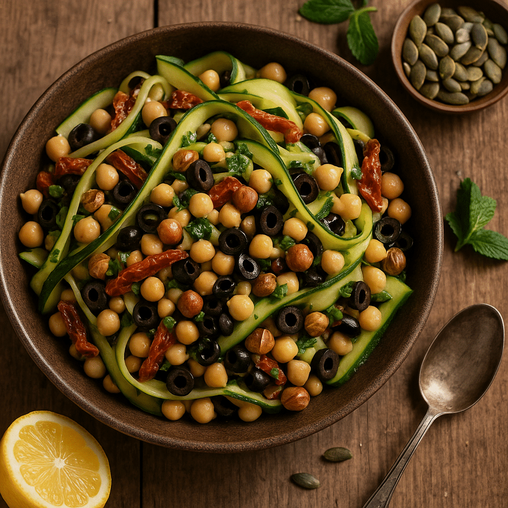 Une salade fraîche et colorée mêlant tagliatelles de courgettes crues, tomates confites, pois chiches, olives noires de Nyons, noisettes croquantes et herbes aromatiques fraîches.