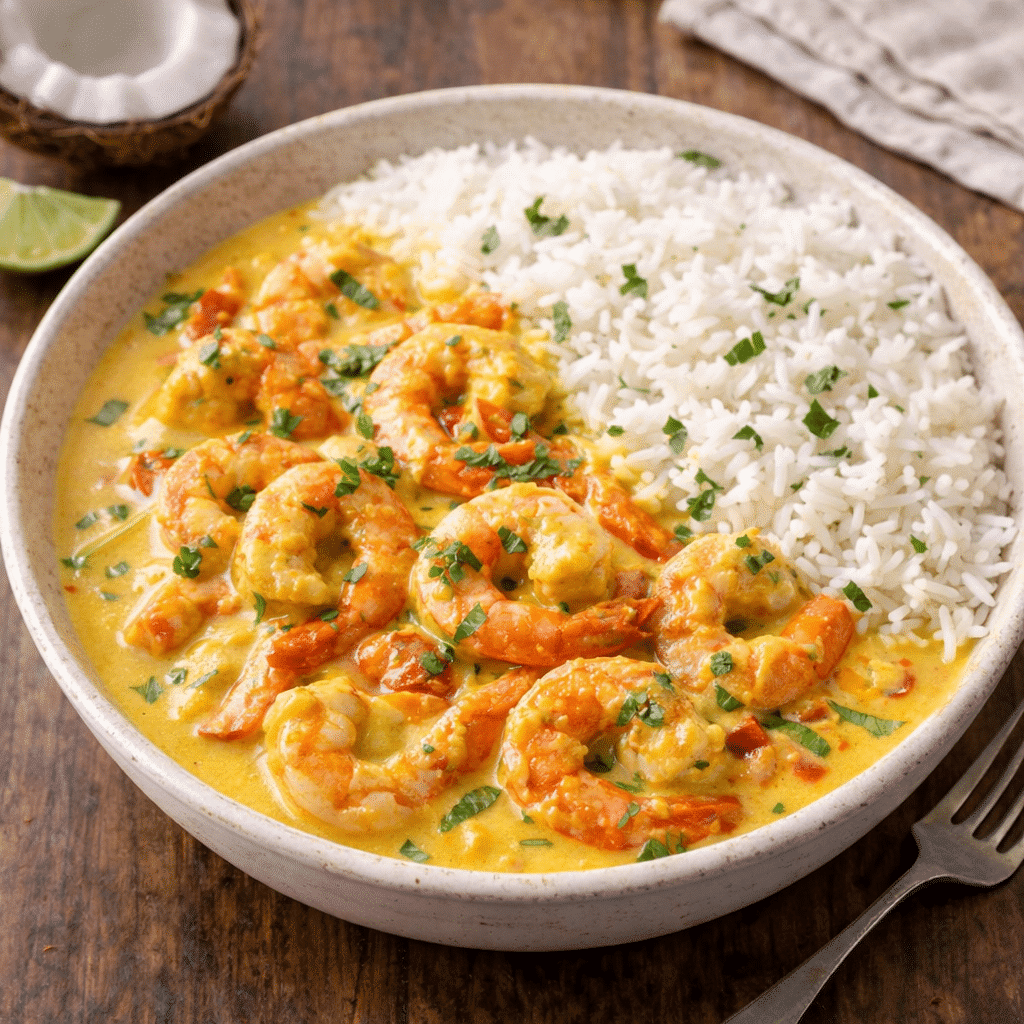Les crevettes, délicatement mijotées, restent tendres et savoureuses, tandis que la sauce onctueuse au lait de coco enveloppe le plat de notes chaudes et réconfortantes.