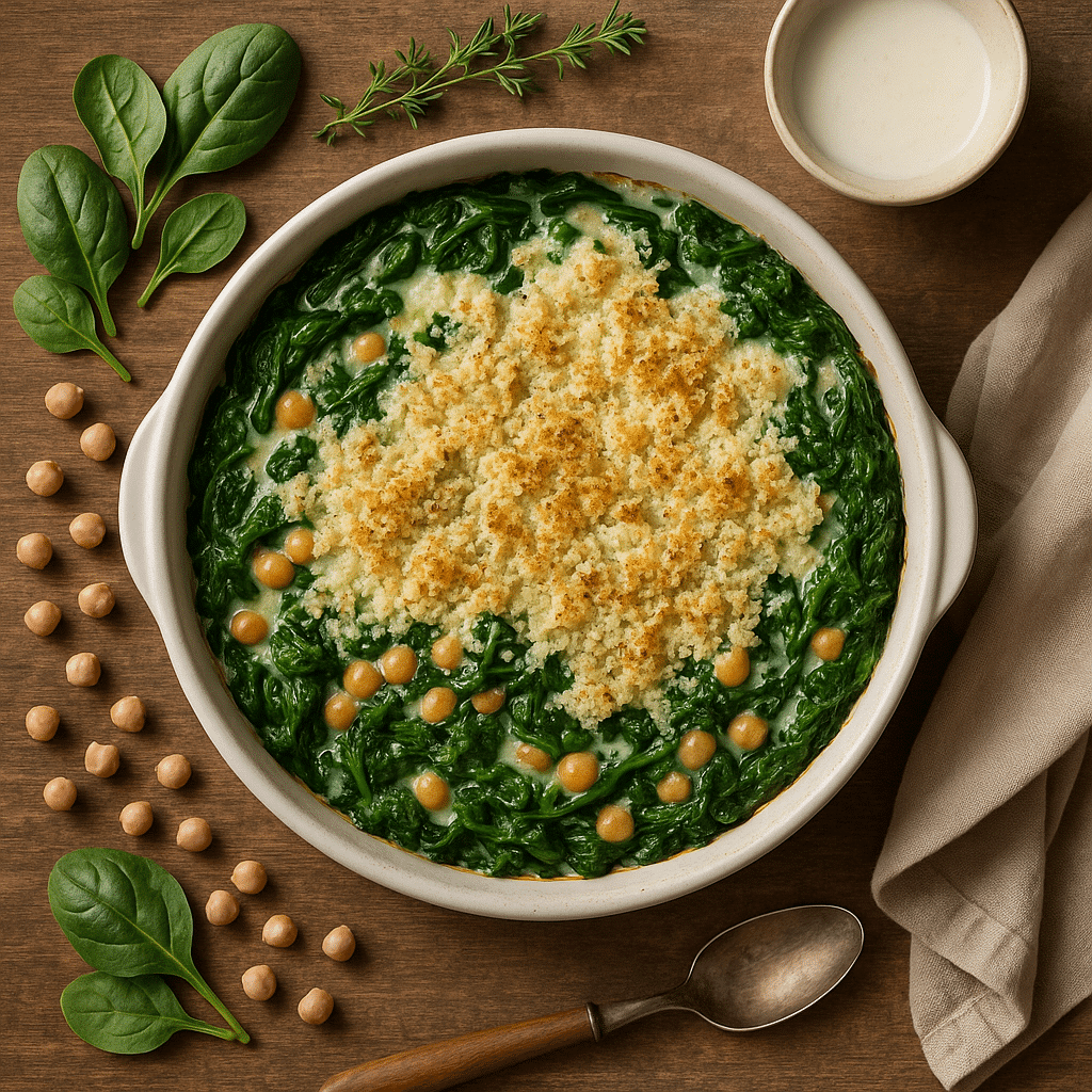 Notre Gratin végan d’épinards & pois chiches façon méditerranéenne est une invitation au voyage ensoleillé. Dans ce plat, les pois chiches riches en protéines se mêlent aux épinards frais et à une sauce tomate mijotée aux épices (cumin, paprika, muscade). Le tout est nappé d’une crème végétale onctueuse, puis gratiné au four avec une croûte dorée de chapelure, d’huile d’olive et de levure maltée. Résultat : une alliance parfaite entre fondant et croustillant, avec des saveurs qui rappellent la Méditerranée. Un plat complet, équilibré et réconfortant, idéal en toute saison.