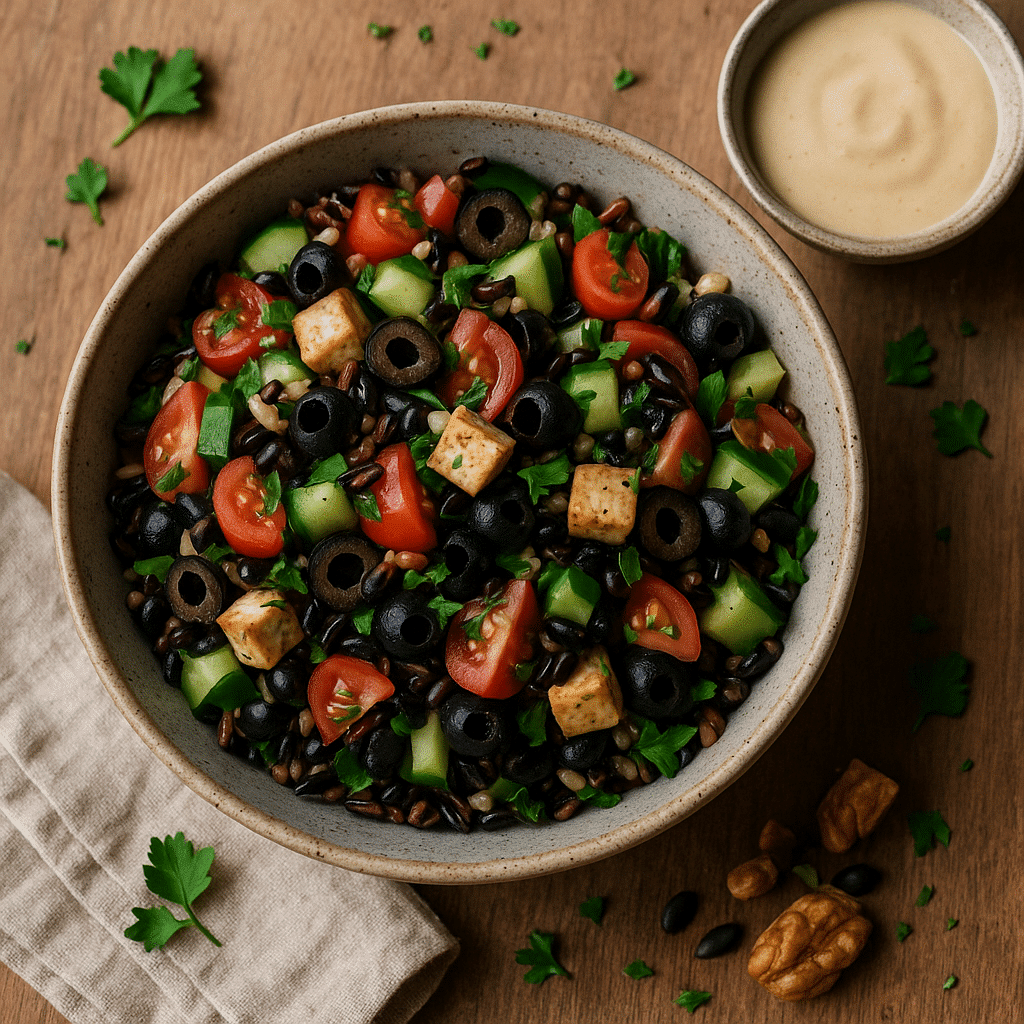 Une salade colorée et complète où légumes frais, riz sauvage et tofu fumé s’unissent pour une assiette 100 % végétale, équilibrée et gourmande.