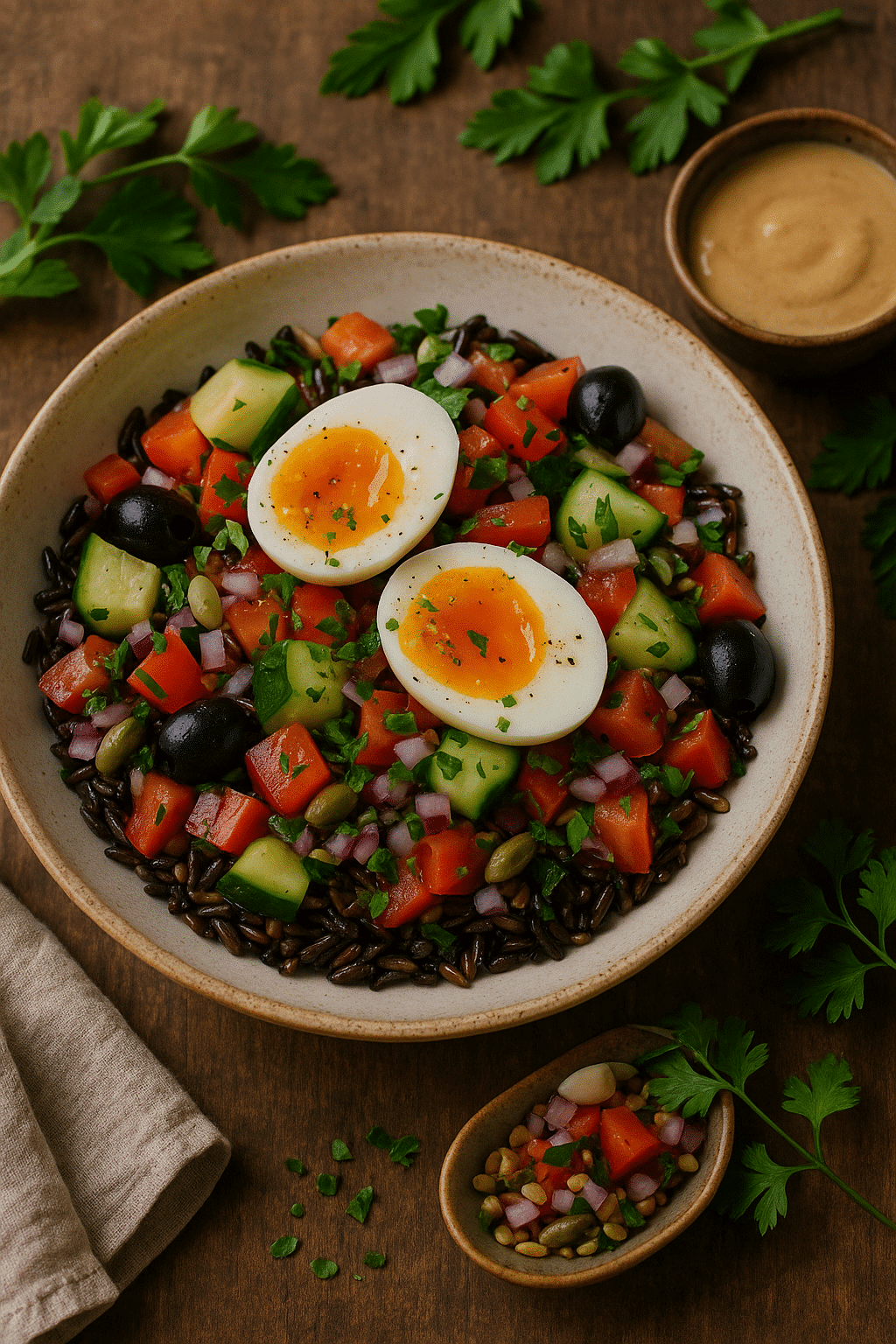 Une salade colorée mariant tomates juteuses, concombre croquant, oignon rouge, olives noires et persil plat, accompagnée de riz sauvage et d’un œuf mollet fondant.