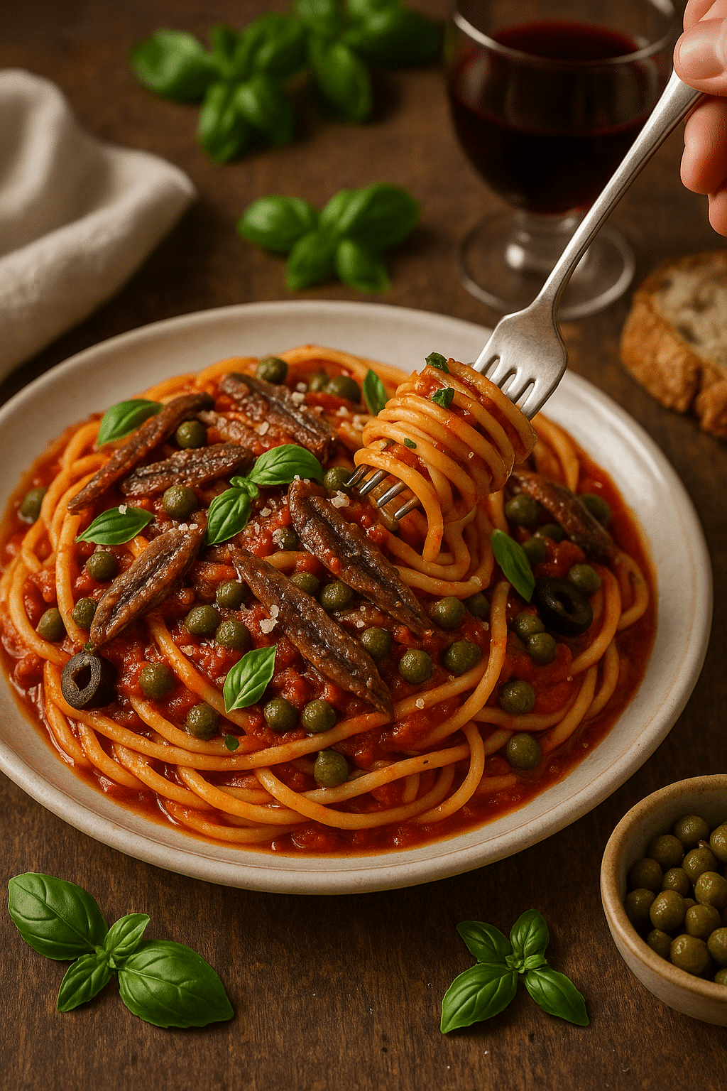 Un grand classique italien : des pâtes linguine nappées d’une sauce tomate mijotée aux anchois, olives et câpres. Un plat généreux et parfumé, prêt à ensoleiller vos repas