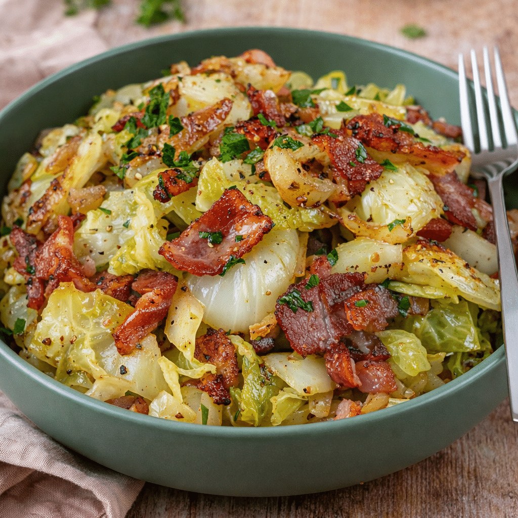 Une poêlée de chou vert fondant aux oignons doucement caramélisés et aux lardons fumés dorés. Simple, généreuse et pleine de goût, cette recette traditionnelle réchauffe le cœur et sublime le légume avec gourmandise.