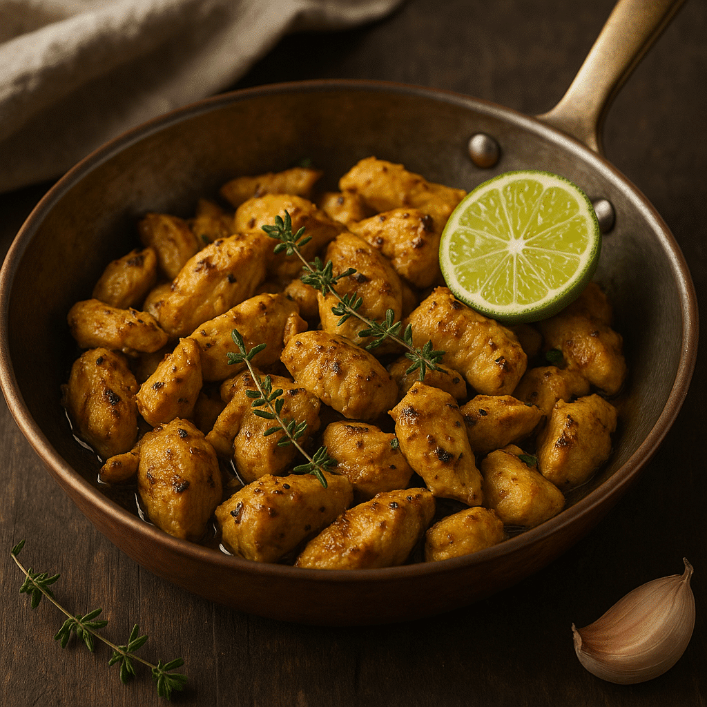 Une poêlée légère et parfumée où le poulet se marie aux notes fraîches de citron vert et combava, relevé par le gingembre, le curcuma et une pointe de piment.