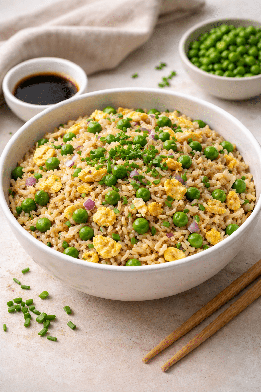 | Ingrédients | Ciboulette ou cibette, Oeuf extra-frais, oignon rouge, Petits pois, Riz basmati semi-complet, sauce de soja |