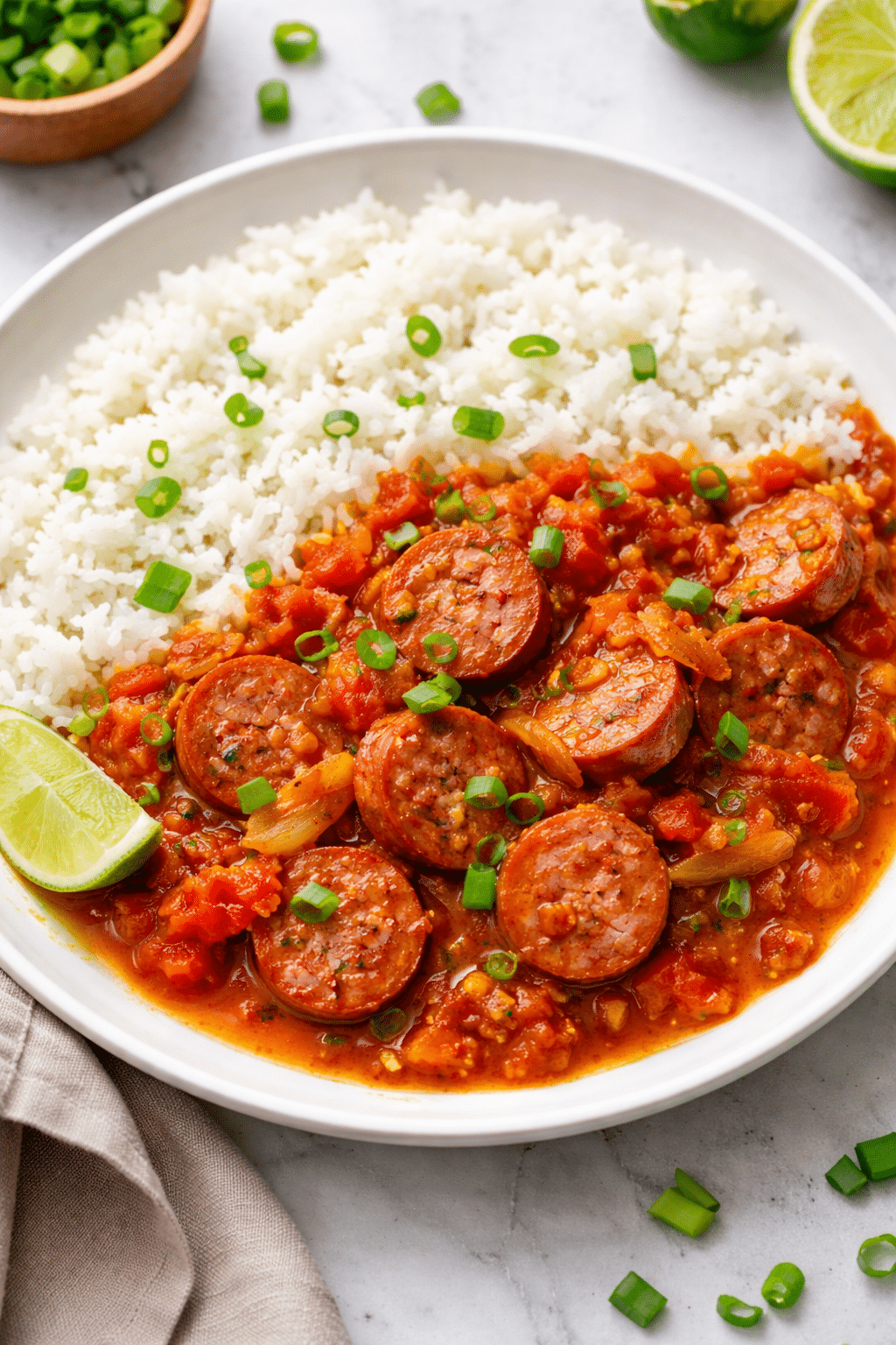 Des merguez (halal) grillées puis coupées en belles rondelles, mijotent doucement avec des oignons en petits dés, des tomates fraîches et un subtil mélange d’épices créoles, de gingembre et de curcuma.