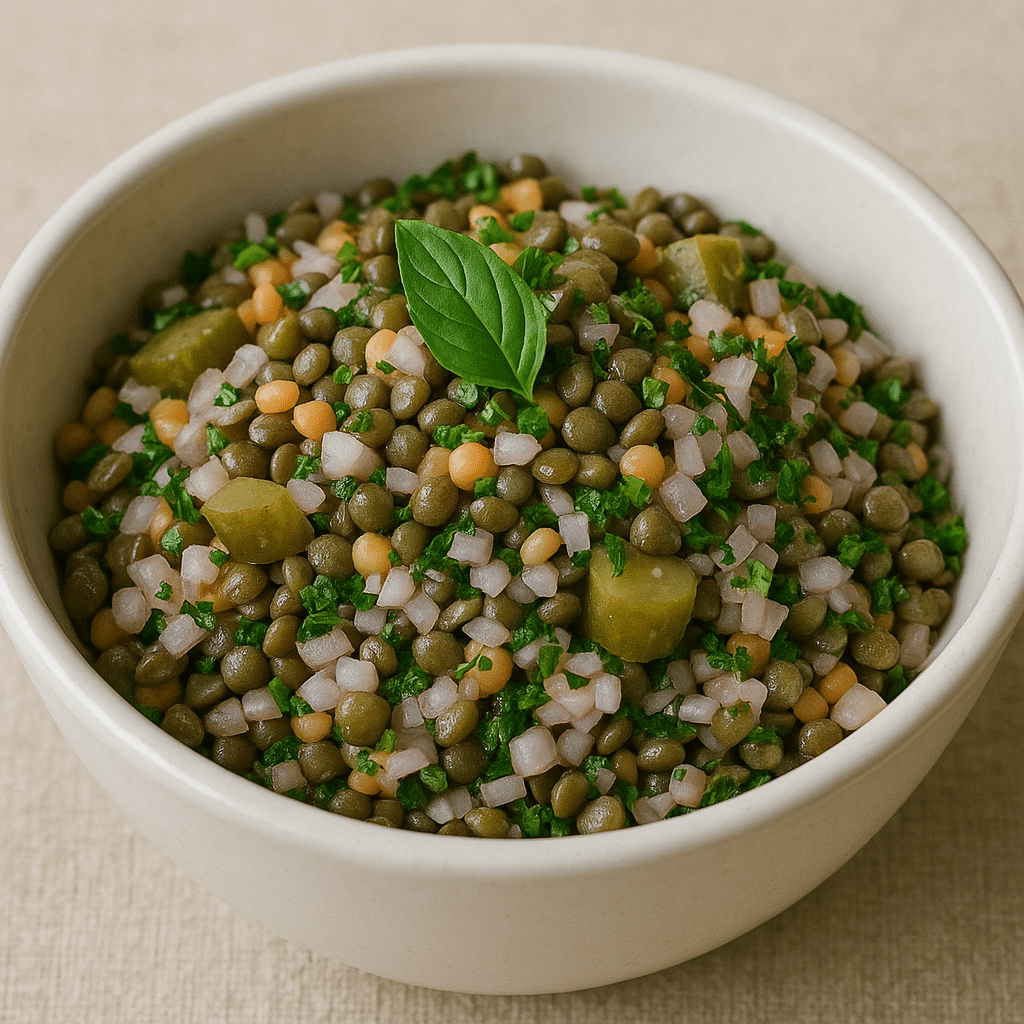 Une salade fraîche, saine et nourrissante, préparée avec un mélange de lentilles vertes et lentilles corail, des échalotes finement ciselées et du persil plat frais.