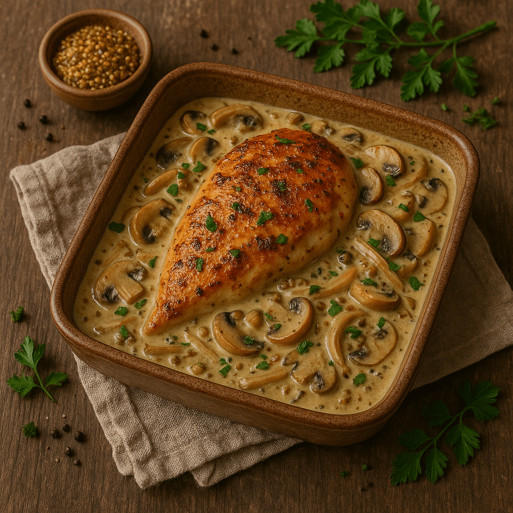Suprême de poulet noir doré au ghee, nappé d’une sauce crémeuse aux champignons, échalotes et moutarde à l’ancienne, parfumée au vin blanc et aux épices douces.