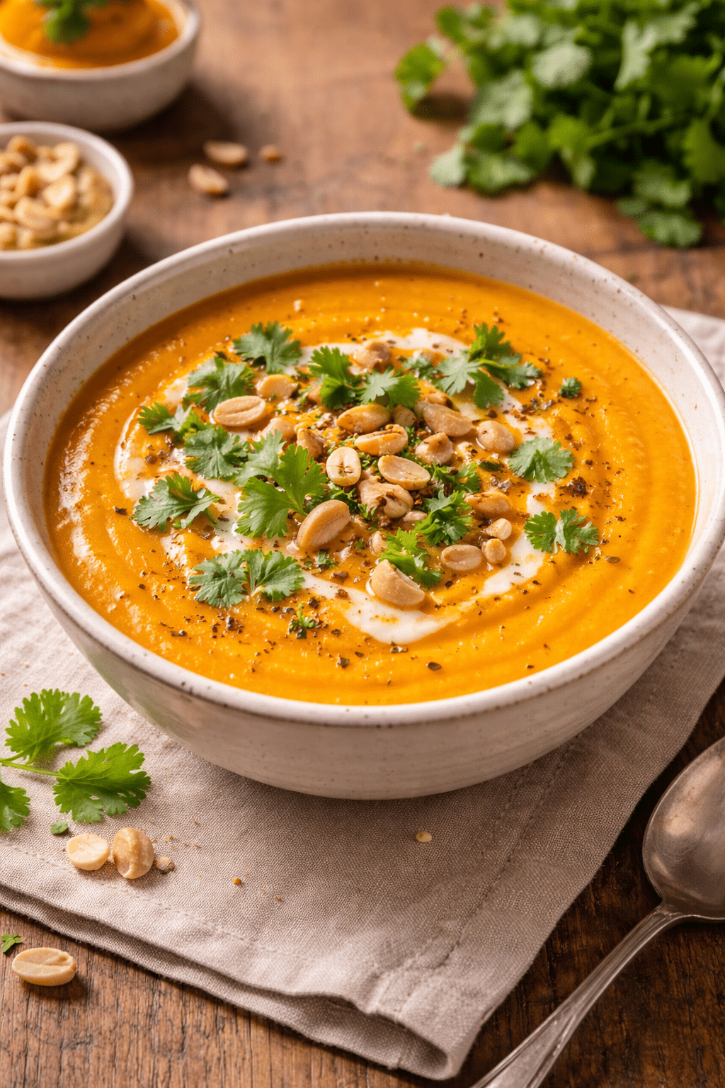 Velouté crémeux de butternut, pommes de terre et carottes, relevé d’une touche de crème d’amande et parsemé de cacahuètes grillées croquantes.