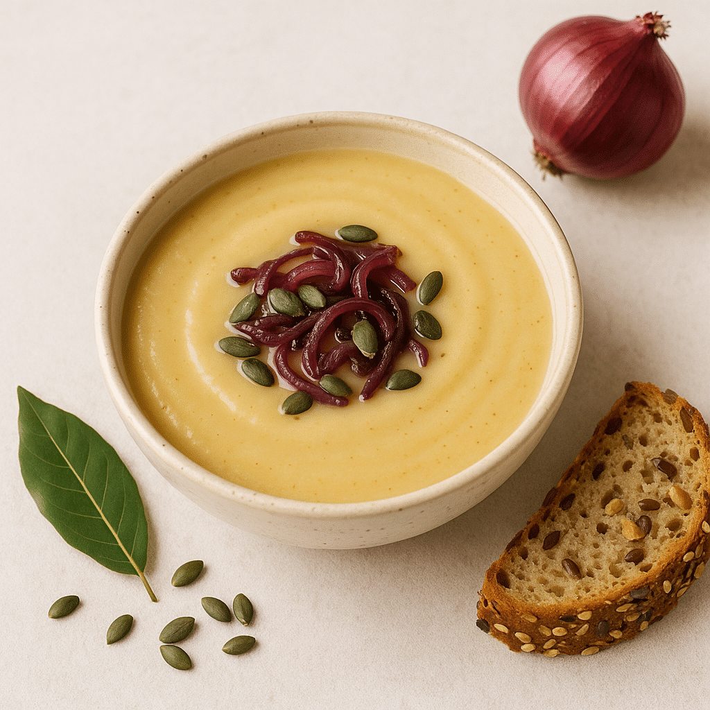 Velouté doux et parfumé de poireaux et carottes, sublimé par la profondeur sucrée des oignons rouges caramélisés et relevé d’épices chaleureuses.